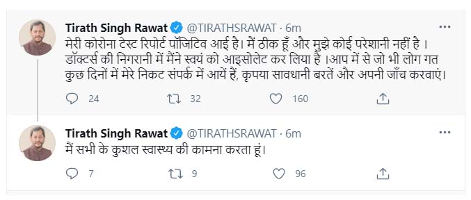 मुख्यमंत्री तीरथ सिंह रावत ने अपने ट्वीटर अकाउंट पर ये जानकारी साझा की है। अपनी पोस्ट में उन्होंने लिखा है कि ‘मेरी कोरोना टेस्ट रिपोर्ट पॉजिटिव आई है। मैं ठीक हूं और मुझे कोई परेशानी नहीं है। डॉक्टर्स की निगरानी में मैंने स्वयं को आइसोलेट कर लिया है। आप में से जो भी लोग गत कुछ दिनों में मेरे निकट संपर्क में आए हैं, कृपया सावधानी बरतें और अपनी जांच करवाएं।