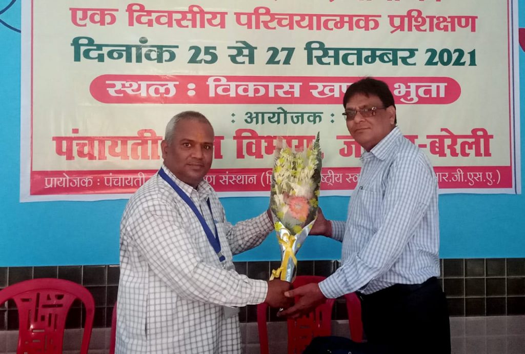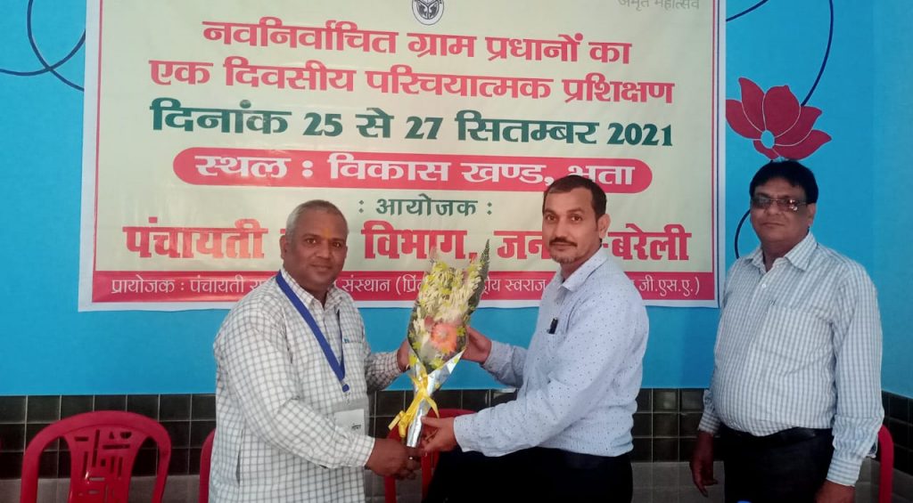 भुता (बरेली)। पंचायती राज प्रशिक्षण संस्थान द्वारा प्रायोजित एवं राष्ट्रीय ग्राम स्वराज अभियान के अंतर्गत पंचायती राज विभाग द्वारा विकास खंड के सभागार में आयोजित नवनिर्वाचित ग्राम प्रधान का विकास खंड स्तरीय एक दिवसीय अनावासीय परिचयात्मक प्रशिक्षण कार्यक्रम के प्रथम बैच का आज समापन हुआ जिसका शुभारंभ सुनौरा मुरारपुर के प्रधान ने दीप प्रज्वलित कर किया। इस अवसर पर एनआईआरडी के राज्य प्रशिक्षक अमित कुमार सिंह तोमर ने प्रशिक्षण देते हुए आय के स्रोत पर चर्चा की और कहां कि आज हमारे आसपास जल, जंगल, जमीन, जानवर और जन के द्वारा आय के कौन-कौन से स्रोत हो सकते हैं जिससे कि पंचायत की आय में बढ़ोतरी हो सके। उन्होंने कहा कि महात्मा गांधी का सपना अब साकार होगा हमारा गांव सशक्त और आत्मनिर्भर बनेगा जिसमें प्रधान की अहम भूमिका को उदाहरण देकर भी समझाया तथा सतत विकास लक्ष्य वर्ष 2030 तक 17 बिंदुओं पर चर्चा करते हुए लक्ष्य तक पहुंचने का संदेश दिया और कहा कि कोई पीछे ना छूटे। पंचायत राज व्यवस्था के बारे में जानकारी देते हुए प्रशिक्षण के उद्देश को बताया और कहां कि वह दिन दूर नहीं जब ग्रामीणों की सहायता से गांव में विकास की गंगा बहेगी । श्री तोमर ने मॉडल पंचायत पर फिल्म दिखाकर प्रधानों को समूह चर्चा के माध्यम से जागरूक किया। ग्राम सभा और ग्राम पंचायत की बैठक एवं समितियों की जानकारी चर्चा एवं फिल्म आदि के द्वारा दी। प्रशिक्षक धनंजय सक्सेना तथा मुकेश चंद्र ममगाई ने विभिन्न विषयों की जानकारी दी। प्रशिक्षकों द्वारा समूह चर्चा, खेल एवं फिल्म के माध्यम से विभिन्न विषयों पर प्रशिक्षण दिया। प्रमुख रूप से ग्राम पंचायत विकास योजना के निर्माण के पांच चरण, स्वास्थ्य एवं पोषण कार्यक्रम में पंचायत की भागीदारी, केंद्रीय एवं राज्य वित्त आयोग की जानकारी के साथ-साथ पंचायत पुरस्कारों, स्वच्छ भारत मिशन, ग्राम स्वराज की जानकारी खेल और फिल्म दिखा कर दी गई।