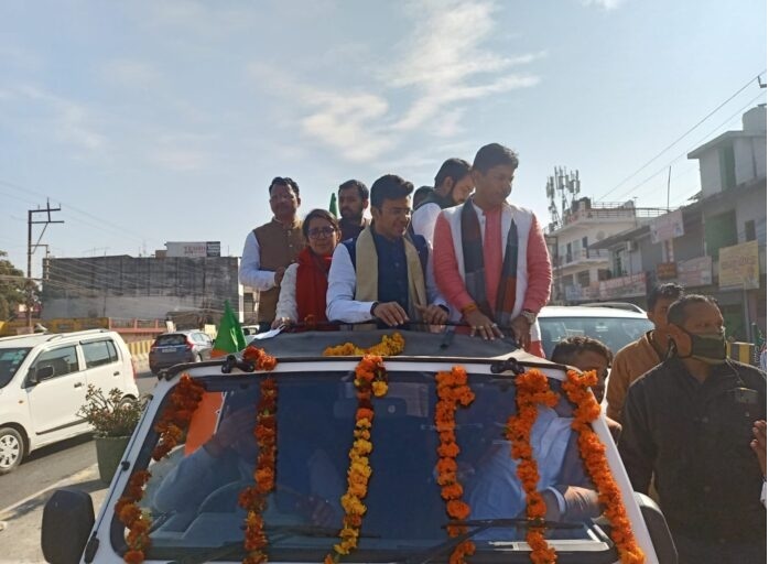 अपने पूर्व निर्धारित कार्यक्रम के तहत आज भाजयूमो के राष्ट्रीय अध्यक्ष तेजस्वी सूर्या आज उत्तराखण्ड की राजधानी देहरादून पहुंचे। इस दौरान शहर में युवा मोर्चा के कार्यकर्ताओं का हुजूम सा उमड़ पड़ा और झंडे बैनर हाथों में लिए हुए कार्यकर्ता काफी उत्साहित नजर आए। बताया जा रहा है कि रोड शो में 2000 बाइक और 1000 कार रैली में शामिल थी। इस दौरान तेजस्वी सूर्या युवा मोर्चा के कार्यकर्ताओं को 2022 के विधानसभा चुनाव के लिए जीत का मंत्र भी देंगे। भाजयुमो के राष्ट्रीय अध्यक्ष बनने के बाद तेजस्वी सूर्या का यह पहला उत्तराखंड दौरा है जिसके लिए भाजयुमो प्रदेश अध्यक्ष कुन्दन लटवाल कई दिनों से तैयारियों में जुटे थे