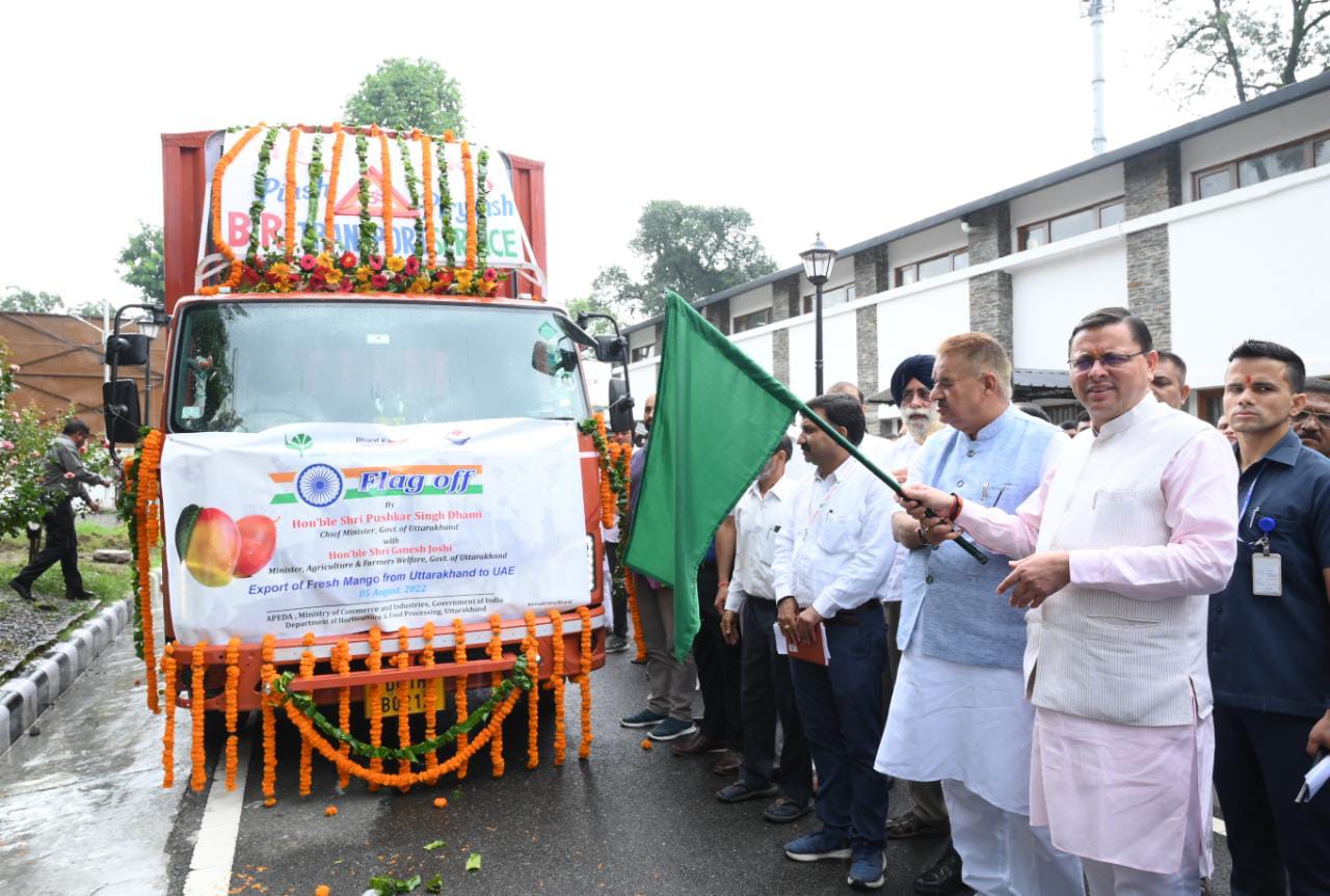 मुख्यमंत्री धामी ने शुक्रवार को मुख्यमंत्री कैम्प कार्यालय से एपिडा के माध्यम से उत्तराखण्ड में उत्पादित आम की प्रथम खेप, शहद एवं राजमा के अन्तरराष्ट्रीय बाजार में निर्यात हेतु भेजे जा रहे वाहनों का फ्लैग ऑफ किया। इस अवसर पर 1.5 टन आम, 28 टन राजमा एवं 80 टन शहद का अन्तरराष्ट्रीय बाजार के लिए निर्यात किया गया। मुख्यमंत्री श्री पुष्कर सिंह धामी ने कहा कि एपिडा के सहयोग से अन्तरराष्ट्रीय बाजार के लिए राज्य के जो उत्पाद भेजे जा रहे हैं, यह सराहनीय पहल है। उन्होंने आशा व्यक्त की कि आने वाले समय में उत्तराखण्ड के स्थानीय उत्पादों की अन्तरराष्ट्रीय मार्केटिंग के लिए गुणात्मक वृद्धि होगी। उत्पादन को कैसे अच्छी मार्केटिंग मिले इस दिशा में सरकार द्वारा लगातार प्रयास किये जा रहे हैं। उत्पादों की ब्रांडिंग, पैकेजिंग और मार्केटिंग पर विशेष ध्यान दिया जा रहा है। उन्होंने कहा कि हमारे स्थानीय उत्पादों को अधिक से अधिक बढ़ावा मिले इसके लिए और अधिक प्रयासों की जरूरत है। राज्य में किसानों की आजीविका को बढ़ाने के लिए एवं आवश्यक सभी व्यवस्थाओं को और प्रभावी बनाने के लिए कृषि कलेण्डर भी बनाया गया है। उत्तराखण्ड के छोटे कृषकों की आर्थिकी को बढ़ाने के लिए कलस्टर के विकास हेतु, सहकारिता, कृषि एवं उद्यान विभाग के माध्यम से अनेक प्रयास किये जा रहे हैं। मुख्यमंत्री ने कहा कि बजट से पूर्व कृषि क्षेत्र के विशेषज्ञों के साथ संवाद किया गया। मुख्यमंत्री ने कहा कि प्रधानमंत्री श्री नरेन्द्र मोदी ने किसानों की आय दुगुनी करने का जो संकल्प लिया है, उस संकल्प को सिद्धि तक पहुंचाने के लिए उत्तराखण्ड में राज्य सरकार द्वारा पूरे प्रयास किये जा रहे हैं। केन्द्र एवं राज्य सरकार की कृषि कल्याण से संबंधित योजनाओं को समाज के अंतिम पंक्ति के लोगों तक पहुंचाया जा रहा है। 2025 में उत्तराखण्ड राज्य स्थापना दिवस की रजत जयंती मनायेगा, तब तक किसानों की आजीविका वृद्धि के लिए कृषि, उद्यान, सिंचाई एवं अन्य संबंधित विभाग पॉयलट प्रोजेक्ट के रूप में क्या कर सकते हैं, इस पर विशेष ध्यान दिया जाए। राज्य के रजत जयंती वर्ष पर सभी विभागों को कुछ ऐसे कार्य करने होंगे, जो देश एवं हिमालयी राज्यों के लिए मॉडल हों। मुख्यमंत्री ने कहा कि राज्य में जल्द किसान प्रोत्साहन योजना लाई जायेगी। कृषि मंत्री जोशी ने कहा कि प्रधानमंत्री श्री नरेन्द्र मोदी के मार्गदर्शन में केन्द्र सरकार द्वारा एवं मुख्यमंत्री के नेतृत्व में राज्य सरकार द्वारा किसानों की आय दोगुनी करने के लिए अनेक योजनाएं संचालित की जा रही हैं। उन्होंने कहा कि उत्तराखण्ड जब राज्य स्थापना दिवस की रजत जयंती मनायेगा, तब तक कृषि एवं उद्यान के क्षेत्र में राज्य में उत्पादन दोग