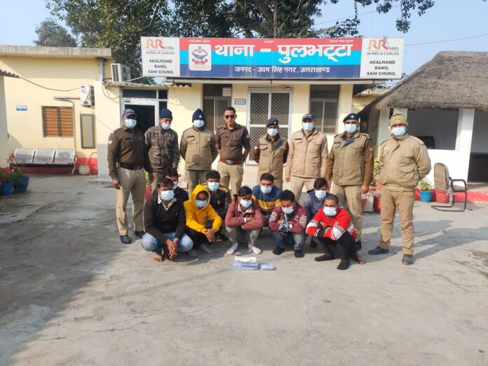जानकारी के अनुसार कल देर रात थाना पुलभट्टा पुलिस को सूचना मिली कि आजाद नगर रोड में एक आम के बगीचे में कुछ लोग सट्टा खेल रहे है। सूचना पर कार्यवाही करते हुए पुलिस ने मौके पर दबिश देकर एक बुकी सहित 9 लोगों को गिरफ्तार कर लिया गया। जिनके पास से सटृा डायरी,पेन और लगभग 20 हजार रूपए व 9 मोबाइल फोन बरामद हुए। पुलिस के अनुसार बरामद किये गये मोबाइल फोनों में लाखों रुपए के सटृे के कारोबार करने का रिकॉर्ड मौजूद है। बताया जा रहा है कि पकड़ा गया किच्छा निवासी मुख्य बुकी पवन कुमार सिंधी सबको सटृा खिला रहा था, वह लोगों को उनका पैसा 8 गुना करने का लालच दे रहा था पूछताछ में पवन कुमार सिंधी द्वारा बताया गया कि वह पूरे किच्छा क्षेत्र से सटृा इकट्ठा कर आगे आगरा के अपने एक रिश्तेदार को देता है। गिरफ्तार किये गये लोगों में पवन कुमार पुत्र किशन चंद निवासी गिद्धपुरी किच्छा (बुकी) आसिफ खान उर्फ विक्की पुत्र याकूब खान निवासी नई सुनहरी वार्ड नंबर 12, सलमान पुत्र रहमान शाह निवासी हैररपुर पीलीभीत, मोहम्मद जावेद पुत्र मोहम्मद हसन निवासी वार्ड नंबर 18 सिरौली कला, मोहम्मद जावेद पुत्र मुशर्रफ, मोहम्मद परवेज पुत्र लियाकत अली, कामिल पुत्र अताउर रहमान, विमल कुमार पुत्र नित्यानंद निवासी सुनहरी वार्ड नंबर 2 व जतिन जोशी पुत्र रामदास जोशी निवासी सैंथल थाना हाफिजगंज बरेली शामिल है।
