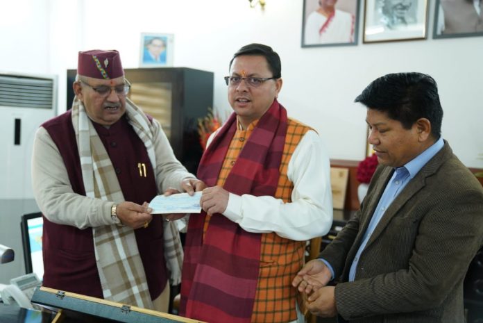 सैनिक कल्याण मंत्री गणेश जोशी ने मुख्यमंत्री राहत कोष में रु 11 लाख की आर्थिक मदद का चेक मुख्यमंत्री को किया भेंट।