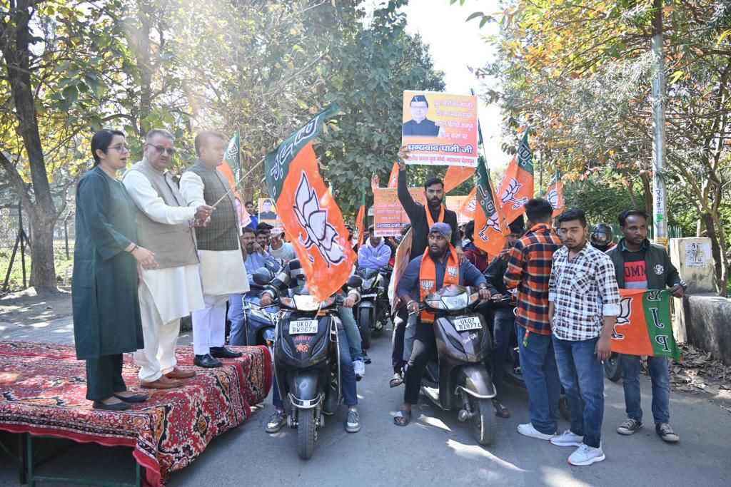 भारतीय जनता युवा मोर्चा शहीद दुर्गा मल्ल मंडल द्वारा धन्यवाद रैली का फ्लैग ऑफ करते मंत्री गणेश जोशी।