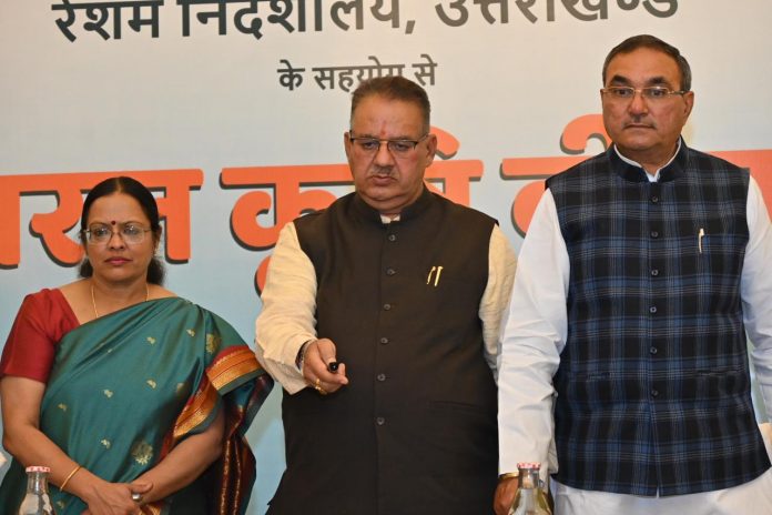 रेशम निदेशालय एवं भारतीय कृषि बीमा कम्पनी द्वारा सरल कृषि बीमा योजना के अंतर्गत रेशम कीट बीमा योजना का शुभारम्भ करते कृषि मंत्री गणेश जोशी
