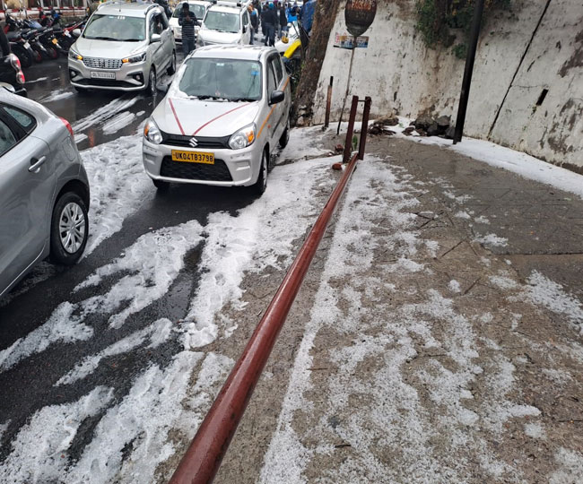 नैनीताल। शुक्रवार दोपहर को मौसम ने करवट बदली और तेज बारिश शुरू हो गई। इसी बीच जबरदस्त ओलावृष्टि होने लगी और सड़कों पर ओलों की बर्फ जैसी सफेद चादर बिछ गई।