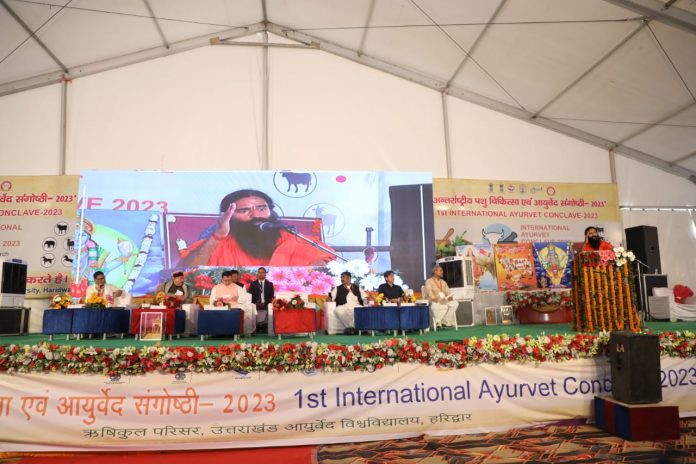 हरिद्वार-उत्तराखंड आयुर्वेद विश्वविद्यालय एवं दीनदयाल कामधेनु गौशाला समिति के संयुक्त तत्वावधान में विशाल पशु चिकित्सा एवं आयुर्वेद के अंतरराष्ट्रीय आयुरवेट कॉन्क्लेव 2023 के समापन सत्र में प्रदेश के मुख्यमंत्री पुष्कर सिंह धामी, पतंजलि योगपीठ के परमाध्यक्ष बाबा रामदेव, पर्यटन मंत्री सतपाल महाराज, अखिल भारतीय गौ सेवा प्रशिक्षण प्रमुख ई राघवन, कुलपति प्रो सुनील जोशी, दीनदयाल कामधेनु गौशाला समिति के उप मंत्री डॉ हेमेंद्र यादव द्वारा सर्वप्रथम धन्वंतरी पूजन एवं गौवंदना के साथ दीप प्रज्वलित कर कार्यक्रम का शुभारंभ हुआ। समारोह के मुख्य अतिथि मुख्यमंत्री पुष्कर सिंह धामी ने कहा कि उत्तराखंड आयुर्वेद, महर्षि चरक ऋषि, कर्म और मर्म की भूमि है। उन्होंने कहा कि प्रदेश में आज प्रधानमंत्री नरेंद्र मोदी के नेतृत्व में हर क्षेत्र में चहुंमुखी विकास हो रहा है। प्रधानमंत्री मोदी के प्रयास से ही योग और आयुर्वेद की पताका पूरे विश्व में फैल रही है। केंद्र और प्रदेश की सरकार आयुष और आयुर्वेद के क्षेत्र में महत्वपूर्ण कार्य कर रही है। उन्होंने कहा कि आयुष चिकित्सा के क्षेत्र में अभूतपूर्व कार्य हुए हैं। आयुर्वेद केवल चिकित्सा पद्धति ही नहीं अपितु जीवन शैली है। यह मात्र बिमारियों का इलाज नहीं करती अपितु आयुर्वेद को अपनाकर हम अपने शरीर को बीमार होने से रोक सकते हैं। बाबा रामदेव ने कहा गाय के दूध के महत्व एवं पंचगव्य चिकित्सकीय गुणों का विस्तृत संदर्भ दिए , तथा बताया कि सारी दुनिया में सबसे ज्यादा गाय का दूध पिया जाता है गाय का दूध में होता है या इम्यूनिटी को बढ़ाता है एवं हमारे संस्थान में गोमूत्र अर्क एवं आयुर्वेद की औषधियों के योग के द्वारा कैंसर जैसी बीमारियों को ठीक किया है, आयुर्वेद के विद्यार्थियों को मोटिवेट करते हुए कहा आयुर्वेद के छात्र सिर्फ चिकित्सा के छात्र नहीं बल्कि आचार्य चरक, आचार्य सुश्रुत जैसे महान ऋषियों की परंपरा के संवाहक है। मधुमेह, उच्च रक्तचाप, कैंसर जैसी भयावह बीमारियों का इलाज एलोपैथ में नहीं है लेकिन आयुर्वेद में इन सभी रोगों का सफल इलाज है यह हमारे लिए गर्व की बात है इसके लिए आयुर्वेद के छात्र गर्व का अनुभव कर सकते हैं। उन्होंने ने कहा कि पतंजलि आयुर्वेद के सभी छात्रों को रोजगार देने के लिए प्रतिबद्ध है। ई राघवन ने कहा कि गाय का इलाज वनस्पतियों से तथा वनस्पतियों की बीमारी का इलाज पंचायत के माध्यम से किया जा सकता है। साथ ही उन्होंने कहा जंगल जी पालता है और जीप जंगल पालता है विटामिन बी 12 2017 कैदियों की कमी गाय के दूध के माध्यम से पूरी होती है अग्नि पुराण में गाय की चिकित्सकीय उपयोग की महिमा का विस्तृत वर्णन किया गया है। उन्होंने सरकार से मांग की जिस तर