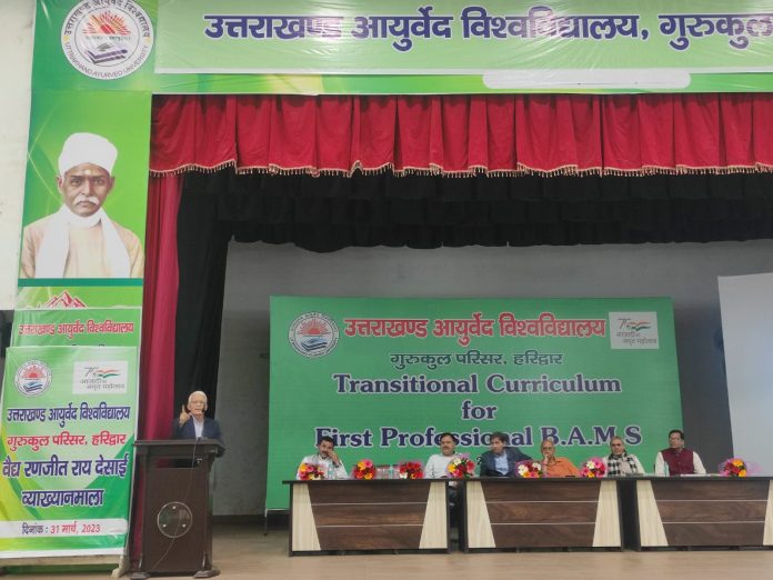 हरिद्वार- आयुर्वेद विश्वविद्यालय के गुरुकुल परिसर में बीएएमएस 2022 बैच के नव आगंतुक बीएएमएस विद्यार्थियों के ट्रांजिशन करिकुलम के समापन एवं एवं वैद्य रंणजीत राय देसाई व्याख्यानमाला के अंतर्गत एक व्याख्यानमाला का आयोजन किया गया। प्रातः विश्वविद्यालय के  कुलपति प्रोफेसर सुनील जोशी एवं मुख्य अतिथि सुप्रसिद्ध सर्जन डॉ विनोद गुप्ता, प्रोफेसर एचएम चंदोला, पूर्व डीन जामनगर विश्वविद्यालय एवं पूर्व डायरेक्टर चौधरी ब्रह्म प्रकाश चरक संस्थान, दिल्ली, विश्वविद्यालय के कुलसचिव प्रोफेसर अनूप गक्खड़, प्रोफेसर पंकज शर्मा कैंपस डायरेक्टर गुरुकुल, प्रोफेसर प्रेमचंद शास्त्री द्वारा संयुक्त रूप से दीप प्रज्वलित किया गया तथा विश्वविद्यालय गीत एवं धन्वंतरी वंदना के उपरांत आगंतुक अतिथियों का स्वागत सम्मान किया गया , तदोपरांत प्रथम वर्ष के विद्यार्थियों ने संस्कृत भाषा में नाट्य मंचन किया।