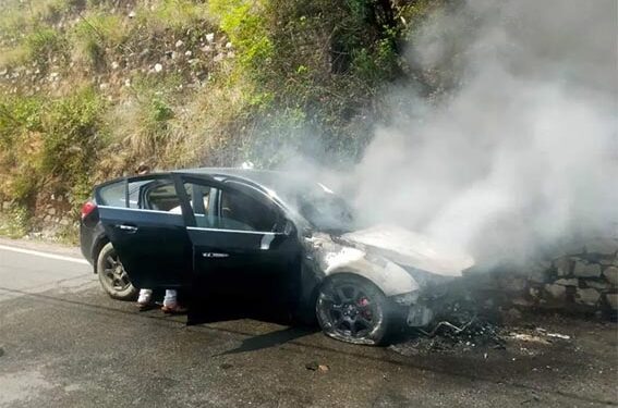 ंनैनीताल। हल्द्वानी से भवाली की ओर एक कार में आमडाली भीमताल के पास अचानक आग लग गई। बताया जा रहा हे कि कार में 4 लोग सवार थे । घटना की जानकारी मिलते ही मौके पर पहुंची भीमताल पुलिस एवं फायर यूनिट ने पानी डालकर आज बुझाया फिलहाल कार सवार दो पुरुष 2 महिला आग लगते ही कार से बाहर निकल गए थे। इसलिए बड़ा हादसा होने से बच गया।