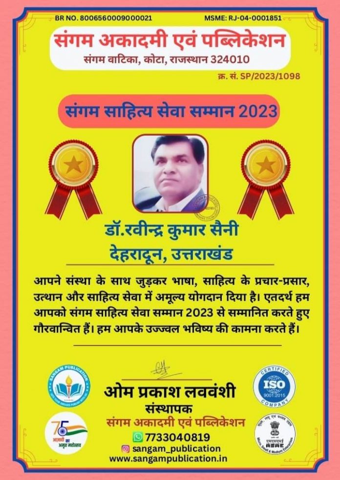 संगम अकादमी एवं पब्लिकेशंस संगम वाटिका कोटा राजस्थान की रजिस्टर्ड प्रतिष्ठित संस्था जो कि साहित्य के क्षेत्र में उल्लेखनीय योगदान देने वाले लेखकों एवं कवियों को उनकी साहित्यिक सेवाओं एवं उपलब्धियों के लिए सम्मानित करती है ने एस. जी. आर. आर. इंटर कॉलेज सहसपुर के प्रधानाचार्य डॉ रविंद्र कुमार सैनी को उनके हिंदी तथा अंग्रेजी दोनों भाषाओं में साहित्य सर्जन करने पर “संगम साहित्य सेवा सम्मान 2023” प्रदान किया है। संस्था के द्वारा डॉ. रविंद्र कुमार सैनी के अंग्रेजी काव्य संग्रह “माई अनरेस्ट्रेन्ड इमोशंस” तथा “फ्रॉम द कोर ऑफ हार्ट” को सम्मान हेतु चयन के लिए सर्वश्रेष्ठ एवं सराहनीय पाया गया जिसके लिए डॉ. सैनी को साहित्य सर्जन क्षेत्र में यह सम्मान प्रदान किया गया है। विदित हो कि साहित्य सर्जन क्षेत्र में डॉ. सैनी को अब तक कई बड़े सम्मान प्राप्त हो चुके हैं। विभिन्न संस्थाओं के द्वारा उन्हें प्रशस्ति पत्र, स्मृति चिन्ह आदि देकर सम्मानित किया जा चुका है। विशेष बात यह है कि उनके अंग्रेजी काव्य संग्रह “फ्रॉम द कोर ऑफ हार्ट” को नेशनल बुक ऑफ रिकॉर्ड्स में भी शामिल किया जा चुका है तथा उन्हें रविंद्रनाथ टैगोर लिटरेचर अवॉर्ड से भी सम्मानित किया जा चुका है। “संगम साहित्य सेवा सम्मान 2023” उनकी साहित्य क्षेत्र में प्राप्त उपलब्धियों में एक और सम्मान जुड़ गया है ।