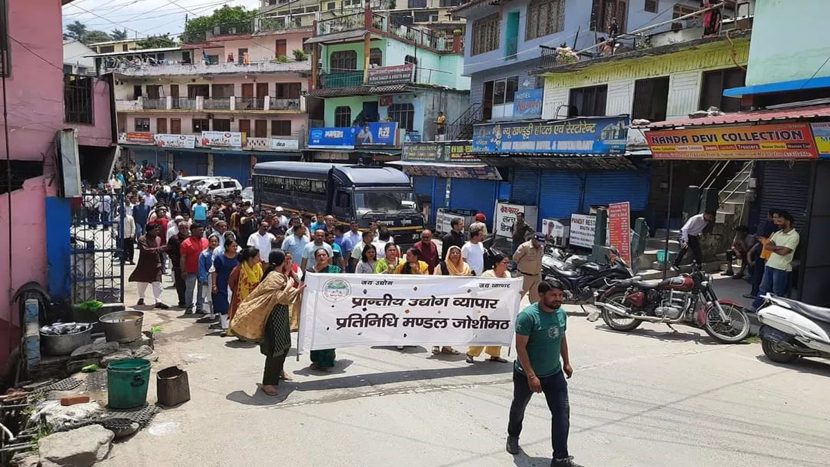 गोपेश्वर। हेलंग मारवाड़ी बाईपास निर्माण के विरोध में जोशीमठ नगर के व्यापारियों ने शुक्रवार को जोशीमठ बाजार बंद रखा। इस अवसर पर जुलूस निकाल कर विरोध प्रदर्शन किया गया।