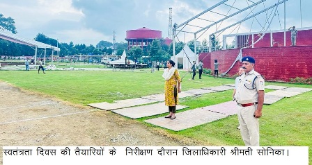 देहरादून (जि.सू.का), स्वतंत्रता दिवस के अवसर पर परेडग्राउण्ड में आयोजित राज्य स्तरीय कार्यक्रम को भव्य एवं ऐतिहासिक स्वरूप देने हेतु ज़िलाधिकारी सोनिका स्वयं तैयारियों के प्रत्येक कार्यों की मॉनिटिरिंग कर रही है। जिसके परिपेक्ष्य में आज उन्होंने प्रातः काल एवं सायं को परेडग्राउण्ड पंहुचकर तैयारियों का जायजा लेते हुए कार्यों में जुटे अधिकारियों को आवश्यक दिशा-निर्देश दिए। निरीक्षण के दौरान जिलाधिकारी ने परेड अभ्यास का अवलोकन किया तथा सम्बन्धित अधिकारी को परेड के लिए बनाए गए पथ को सुन्दर स्वरूप देना सुनिश्चित करें। वहीं उन्होंने आयोजित कार्यक्रम में दर्शक दीर्घा एवं गणमान्यों के लिए बनाए गई दीर्घा आदि की सुरक्षा को दृष्टिगत रखते हुए समुचित व्यवस्था बनाई जाए। उन्होंने मौके पर उपस्थित लोनिवि के अधिकारियों को निर्देशित किया कि कार्यों में तेजी लाते हुए यथाशीघ्र कार्य पूर्ण करें। निरीक्षण के दौरान अवर अभियन्ता लोनिवि उषा भण्डारी, पीटीआई पुलिस रविन्द्र कुमार, सहायक अभियन्ता के. के उनियाल, एवं सम्बन्धित अधिकारी कार्मिक उपस्थित रहे।