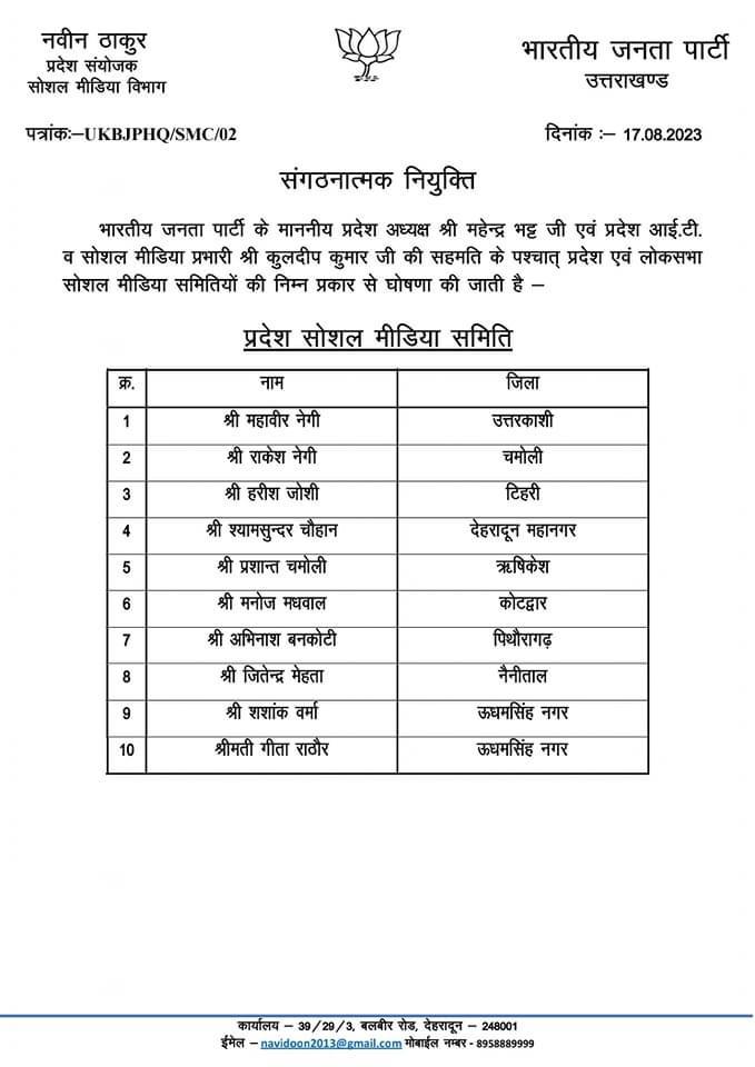 देहरादून 18 अगस्त , भाजपा ने लोक सभा चुनावों के मद्देनजर प्रदेश शोसल मीडिया समिति और 5 लोक सभा क्षेत्रो के लिए सोशल मीडिया समिति गठित कर दी है।