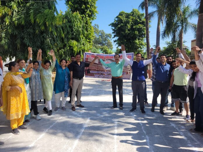 मुक्त अभियान के अंतर्गत शिक्षक, कर्मचारी और छात्र छात्रों के द्वारा विशाल मानव श्रृखंला बनाई गई