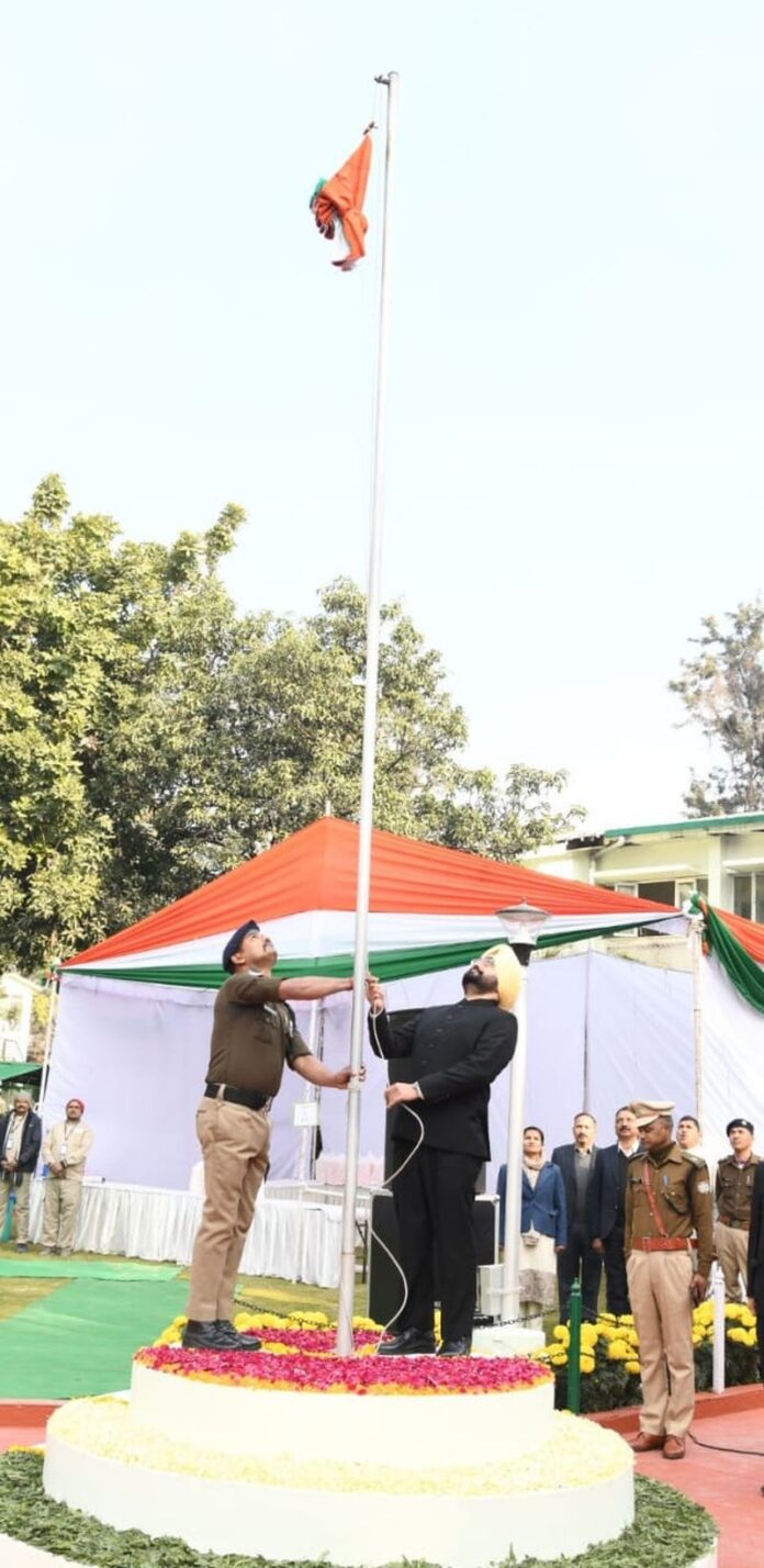 आज यहां मुख्य सचिव डॉ. एस.एस. संधु ने गणतंत्र दिवस के अवसर पर सचिवालय में राष्ट्रीय ध्वज फहराया। इस अवसर पर मुख्य सचिव ने सचिवालय के सभी अधिकारियों, कर्मचारियों एवं उनके परिजनों को गणतंत्र दिवस की बधाई दी। उन्होंने कहा कि गणतंत्र देश की बहुत बड़ी विशेषता यह होती है कि यह देश के प्रत्येक नागरिक को देश के शीर्षतम् पद तक पहुंचने का अधिकार देता है। मुख्य सचिव ने सचिवालय में आयोजित ध्वजारोहण कार्यक्रम को सम्बोधित किया। कार्यक्रम को संबोधित करते हुए उन्होंने भारत के संविधान में उल्लिखित नागरिकों के मूल कर्त्तव्यों पर ध्यान आकृषित करते हुए 10वें मूल कर्त्तव्य ट्टव्यक्तिगत और सामूहिक गतिविधि के सभी क्षेत्रों में उत्कृष्टता की दिशा में निरन्तर प्रयास करना ताकि राष्ट्र निरन्तर प्रयास और उपलब्धि के उच्च स्तर तक पहुंचेट्ट को आत्मसात् करने पर बल दिया। उन्होंने कहा कि हम अपने उत्कृष्ट निर्णयों और कार्यों से प्रदेश और प्रदेश के नागरिकों के जीवन में सकारात्मक प्रभाव डाल कर उनके विकास में महत्त्वपूर्ण भूमिका निभा सकते हैं। इस अवसर पर अपर मुख्य सचिव श्रीमती राधा रतूड़ी, प्रमुख सचिव आर. के. सुधांशु, एल. फैनाई, सभी सचिव एवं अपर सचिव सहित सचिवालय के अधिकारी कर्मचारी उपस्थित थे।