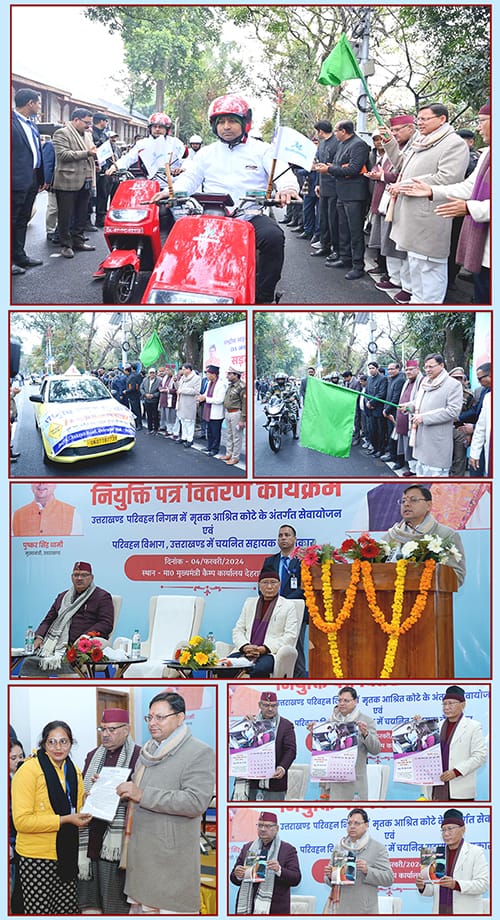 देहरादून मुख्यमंत्री पुष्कर सिंह धामी ने मुख्यमंत्री कैम्प कार्यालय स्थित मुख्य सेवक सदन में परिवहन निगम के अन्तर्गत चालक एवं परिचालक पद के लिए 1०6 अभ्यर्थियों को नियुक्ति पत्र प्रदान किये। इन अभ्यर्थियों को मृतक आश्रित के रूप में परिवहन विभाग में नियुक्ति दी गई है। परिवहन विभाग के अन्तर्गत चयनित 16 सहायक लेखाकारों को भी मुख्यमंत्री ने नियुक्ति पत्र प्रदान किये।