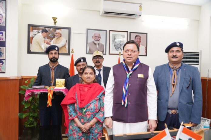 देहरादून-भारत स्काउट एंड गाइड उत्तराखण्ड द्वारा संगठन के 75वें स्थापना दिवस के उपलक्ष्य में आज सचिवालय में मुख्यमंत्री पुष्कर सिंह धामी को फ्लैग स्टिकर लगाकर अलंकृत किया गया।