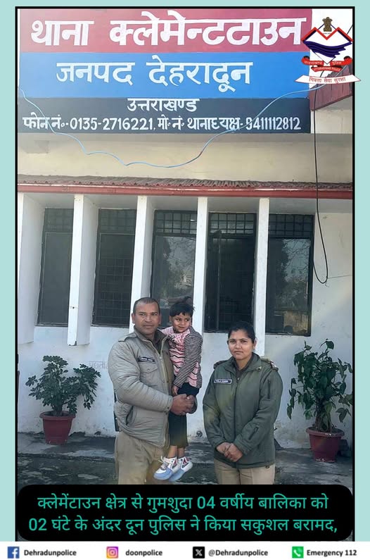 देहरादून -क्लेमेंटाउन क्षेत्र से गुमशुदा 04 वर्षीय बालिका को 02 घंटे के अंदर दून पुलिस ने किया सकुशल बरामद,