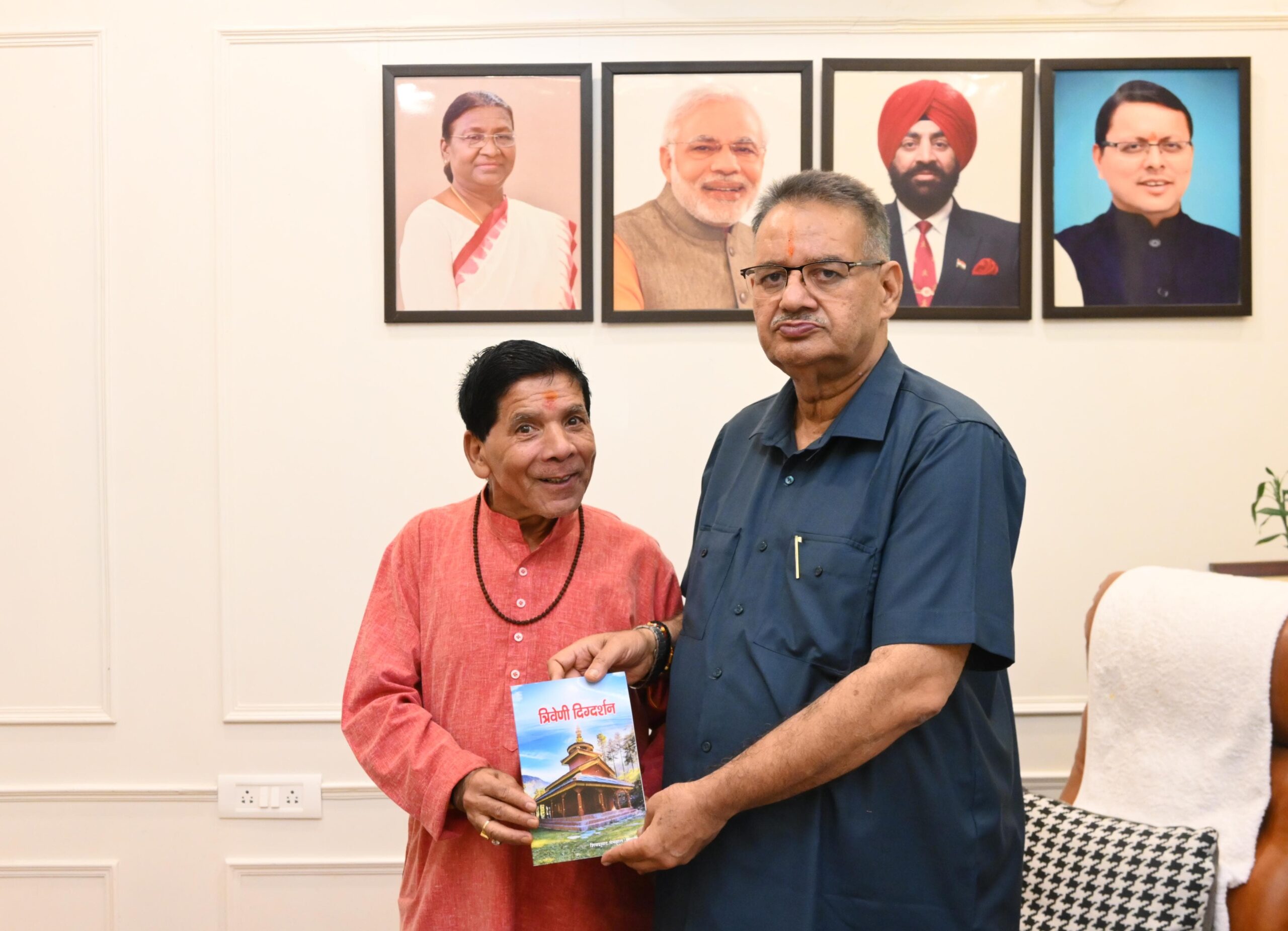 कैबिनेट मंत्री गणेश जोशी को जगन्नाथ मन्दिर पर आधारित त्रिवेणी दिग्दर्शन पुस्तक भेंट करते लेखक शिवप्रसाद सेमवाल शास्त्री