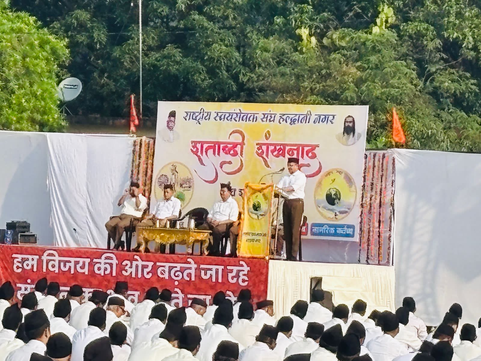 हल्द्वानी-राष्ट्रीय स्वयंसेवक संघ के शताब्दी वर्ष के उपलक्ष्य पर रविवार को एमबी इंटर कॉलेज, हल्द्वानी के मैदान में एकत्रीकरण कार्यक्रम शताब्दी शंखनाद का भव्य आयोजन किया गया। स्वयंसेवकों ने बांसुरी वादन के साथ बजते कुमाऊंनी लोक गीत दैणा होया खोली का गणेशा हे… की मधुर ध्वनि में योग और आसन का प्रदर्शन किया। इस विशाल आयोजन में हजारों स्वयंसेवकों और नागरिकों ने प्रतिभाग किया। संघ के सह सरकार्यवाह श्रीमान आलोक कुमार जी मुख्य वक्ता रहे। उन्होंने विजयदशमी के महत्व पर प्रकाश डालते हुए कहा कि यह दिन अधर्म पर धर्म, अन्याय पर न्याय और असत्य पर सत्य की जीत का दिन हैं। महिषासुर से लेकर रावण का वध आश्विन मास के शुक्ल पक्ष की दशमी तिथि को हुआ। भारत की परंपरा में इस दिन शस्त्रों की पूजा का विधान होने के साथ ही राजाओं द्वारा सीमा उलंघन कर दूसरे की सीमा में प्रवेश का दिन के रूप में भी मनाया जाता था तभी से शस्त्र पूजन कर राज्य विस्तार की परंपरा प्रारम्भ हुई।