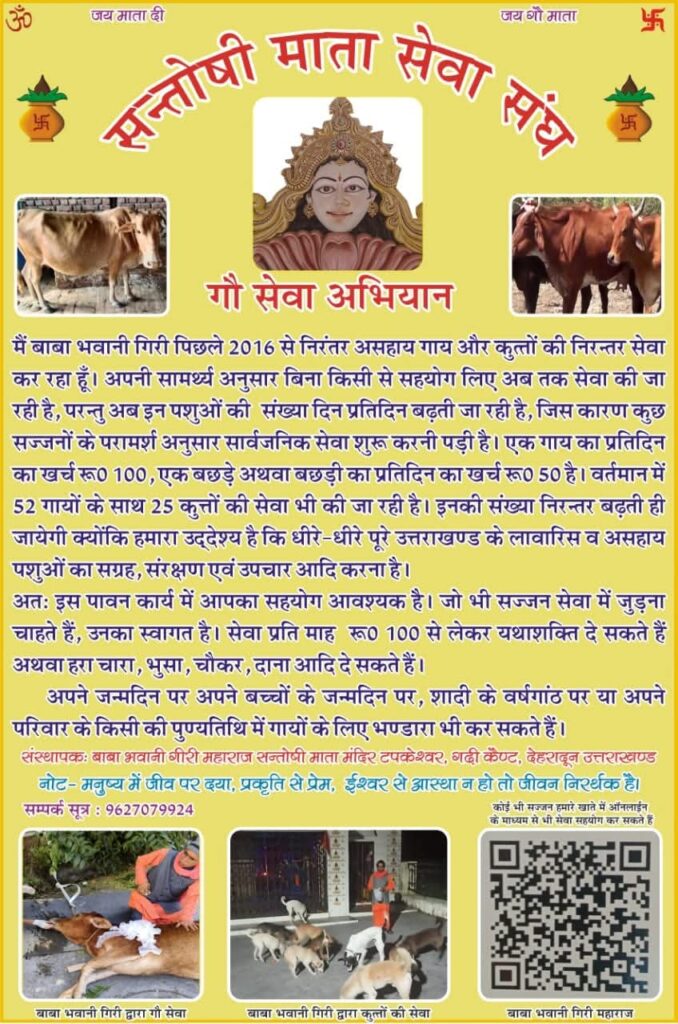 कहानी की शुरुआत 1990 के दशक से होती है। टपकेश्वर क्षेत्र में मां संतोषी माता मंदिर की स्थापना के बाद बाबा भवानी गिरी जी महाराज का ध्यान धीरे-धीरे सड़कों पर घूमने वाली गौमाता की ओर गया। उस समय देहरादून की सड़कों पर भी आज की तरह ही बड़ी संख्या में आवारा गोवंश दिखाई देता था। तेज रफ्तार वाहनों की चपेट में आकर कई गायें घायल हो जाती थीं, तो कुछ गंभीर बीमारी के कारण तड़पती रहती थीं।